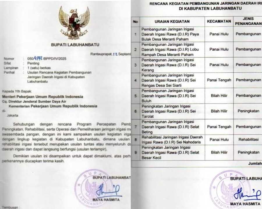 AKARRUMPUT.COM, Labuhanbatu – Pemerintah Kabupaten Labuhanbatu melalui Bupati Maya Hasmita resmi mengajukan sembilan usulan kegiatan pembangunan, peningkatan, dan rehabilitasi jaringan irigasi ke Kementerian Pekerjaan Umum dan Perumahan Rakyat (PUPR) RI.
