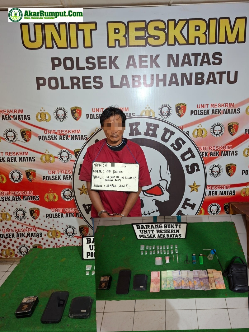 AKARRUMPUT.COM, Labura – Unit Opsnal Polsek Aek Natas, Polres Labuhanbatu berhasil mengungkap kasus penyalahgunaan narkotika jenis sabu di wilayah hukumnya. Seorang pria berinisial AA alias Ayub (47), warga Dusun II Desa Perkebunan Padang Halaban, Kecamatan Aek Kuo, Kabupaten Labuhanbatu Utara, diamankan bersama sejumlah barang bukti pada Rabu (23/04/2025) sekitar pukul 18.20 Wib.