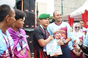Dandim 0209/Labuhanbatu, Letkol Kav. Hanung Kaptiaji, S.Sos., M.I.P., berkesempatan memberikan simbolik hadiah kepada salah satu Atlit yang berhasil menjadi juara