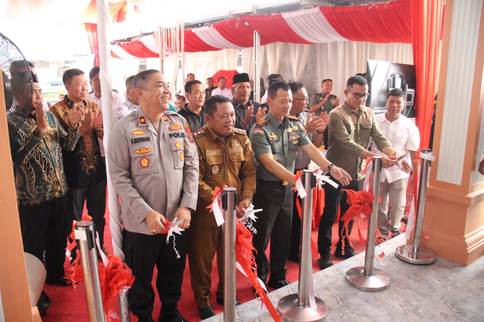Kasat Narkoba Labusel, Dandim 0209/LB, Wakil Bupati Labuhanbatu dan Waka Polres Labuhanbatu saat gunting pita peresmian Kantor Unit Intel Kodim 0209/LB. Selasa (26/08/2025)