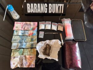 Petugas turut menyita berbagai barang bukti lain, termasuk alat hisap sabu, kaca pirex, plastik klip kosong, rokok berisi ganja, serta satu unit ponsel Android.