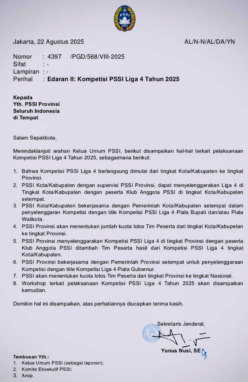 Pengumuman itu tertuang dalam surat edaran bernomor 4397/PGD/568/VIII-2025 yang ditandatangani oleh Sekretaris Jenderal PSSI, Yunus Nusi, S.E., pada 22 Agustus 2025. Dalam edaran tersebut, dijelaskan bahwa Liga 4 2025 akan dimulai di tingkat kota/kabupaten. PSSI daerah setempat, dengan supervisi PSSI provinsi, diberi kewenangan menyelenggarakan turnamen yang diikuti klub-klub anggota PSSI.